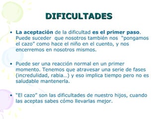 El documento describe las dificultades que enfrentan los padres con hijos que tienen necesidades especiales y ofrece estrategias para lidiar con esas dificultades. Algunas de las dificultades mencionadas son la aceptación de la situación, los sentimientos de temor e incertidumbre, y las barreras impuestas por los propios miedos de los padres. El documento también sugiere estrategias como establecer metas pequeñas, confiar en los profesionales y otros que brindan apoyo, y enfocarse en el presente en