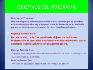 El documento resume los objetivos y resultados de la primera fase de un programa de desarrollo local con equidad de género en Suchitoto, El Salvador. El programa fortaleció la organización de mujeres a nivel municipal y capacitó a 431 mujeres líderes comunitarias para promover la participación femenina. También creó espacios de colaboración entre las organizaciones de mujeres y las instituciones locales para impulsar políticas de igualdad de género.