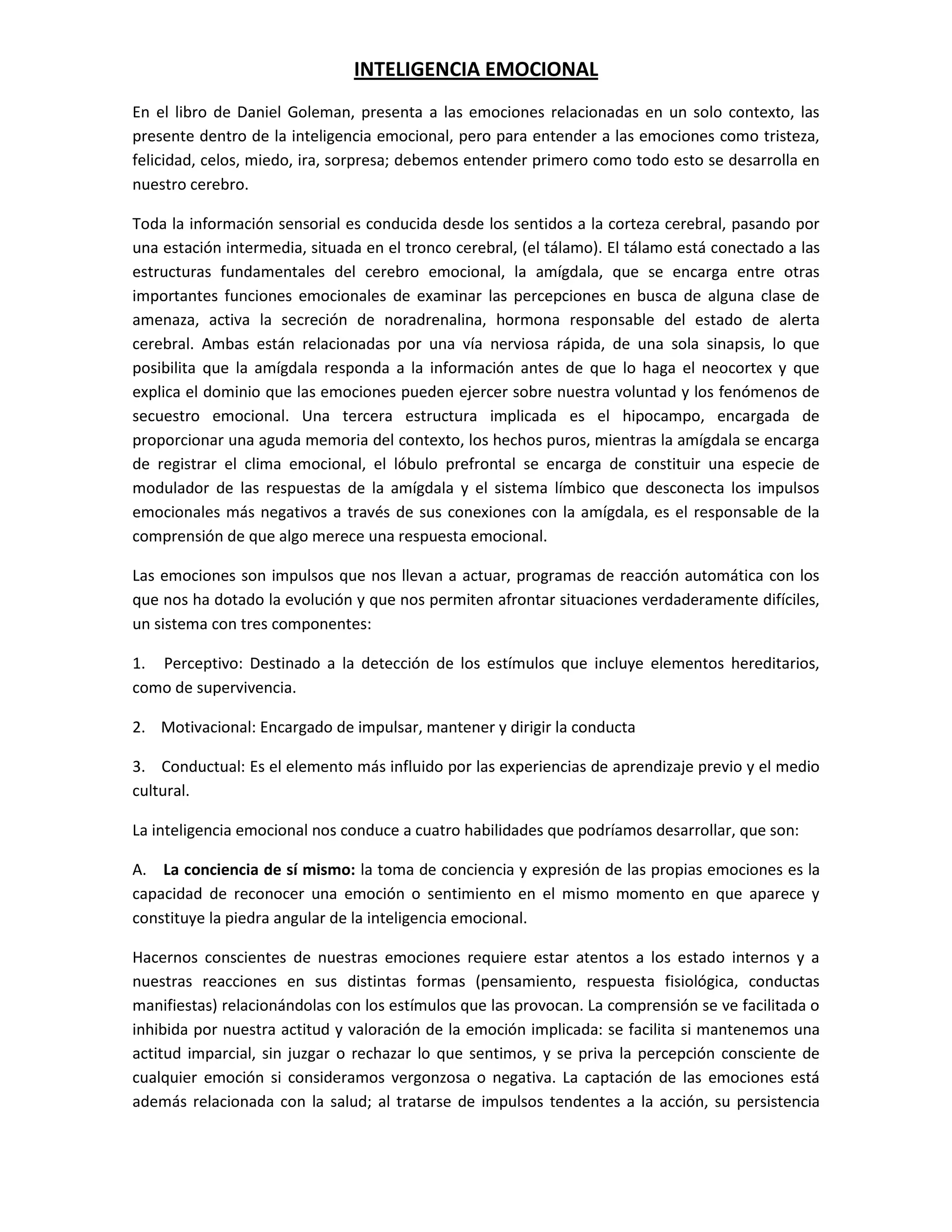Este documento explica la inteligencia emocional y las emociones. Describe cómo la información sensorial llega al cerebro y cómo estructuras como la amígdala y el hipocampo procesan las emociones. Explica que las emociones tienen tres componentes: perceptivo, motivacional y conductual. Finalmente, detalla cuatro habilidades de la inteligencia emocional: la conciencia de sí mismo, la autoregulación, la motivación y la empatía.