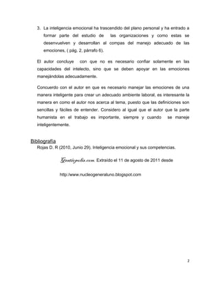 El documento resume un artículo sobre la inteligencia emocional y cómo manejar las emociones en el lugar de trabajo y la vida social. Explica que la inteligencia emocional implica conocer y manejar nuestras propias emociones y las de los demás para mejorar las relaciones interpersonales. También señala que la inteligencia emocional es importante para el éxito de las organizaciones y que es necesario apoyarse en las emociones al igual que en las capacidades intelectuales.