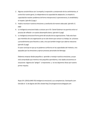 El documento habla sobre la importancia de la inteligencia emocional en el ámbito laboral. Explica que la inteligencia emocional implica reconocer y canalizar adecuadamente las emociones a través de características como la empatía y el control del genio. También menciona que Daniel Goleman considera que la inteligencia emocional permite reflexionar sobre el desempeño diario y que es una parte importante del estudio de las organizaciones, ya que los miembros deben saber relacionarse entre sí.