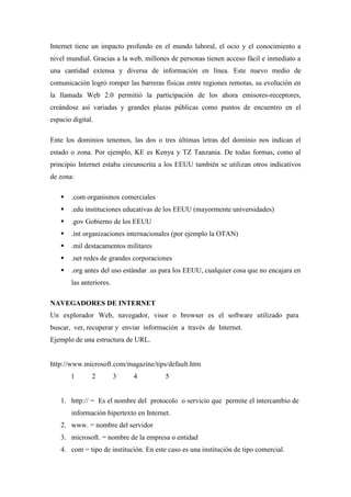 Internet es una red mundial de redes interconectadas que usa el protocolo TCP/IP. Se originó en 1969 como ARPANET para conectar universidades en EE.UU. y ha crecido para incluir a personas de todo el mundo. Proporciona acceso a páginas web, correo electrónico, videos y más, lo que ha revolucionado la comunicación, educación y acceso a la información a nivel global.