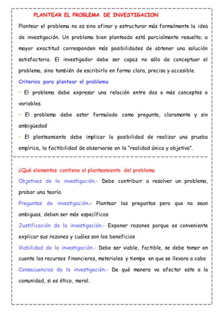 Este documento resume los principales aspectos del proceso de investigación, incluyendo cómo se originan las ideas de investigación, la necesidad de conocer los antecedentes, cómo plantear el problema de investigación, desarrollar la perspectiva teórica, definir el alcance de la investigación (exploratorio, descriptivo, correlacional o explicativo), y formular hipótesis. Explica que las investigaciones pueden tener diferentes alcances y que depende del conocimiento actual del tema y la perspectiva del investigador cómo iniciar una investigación.