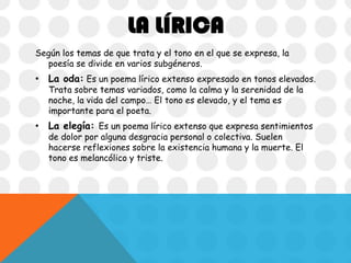 Este documento resume conceptos clave de la poesía lírica y la métrica, incluyendo géneros líricos como la oda y la elegía, partes del verso como el sujeto y el predicado, y elementos métricos como la estrofa, el número de sílabas, y los tipos de rima. También explica conceptos gramaticales como el hiperónimo e hipónimo.