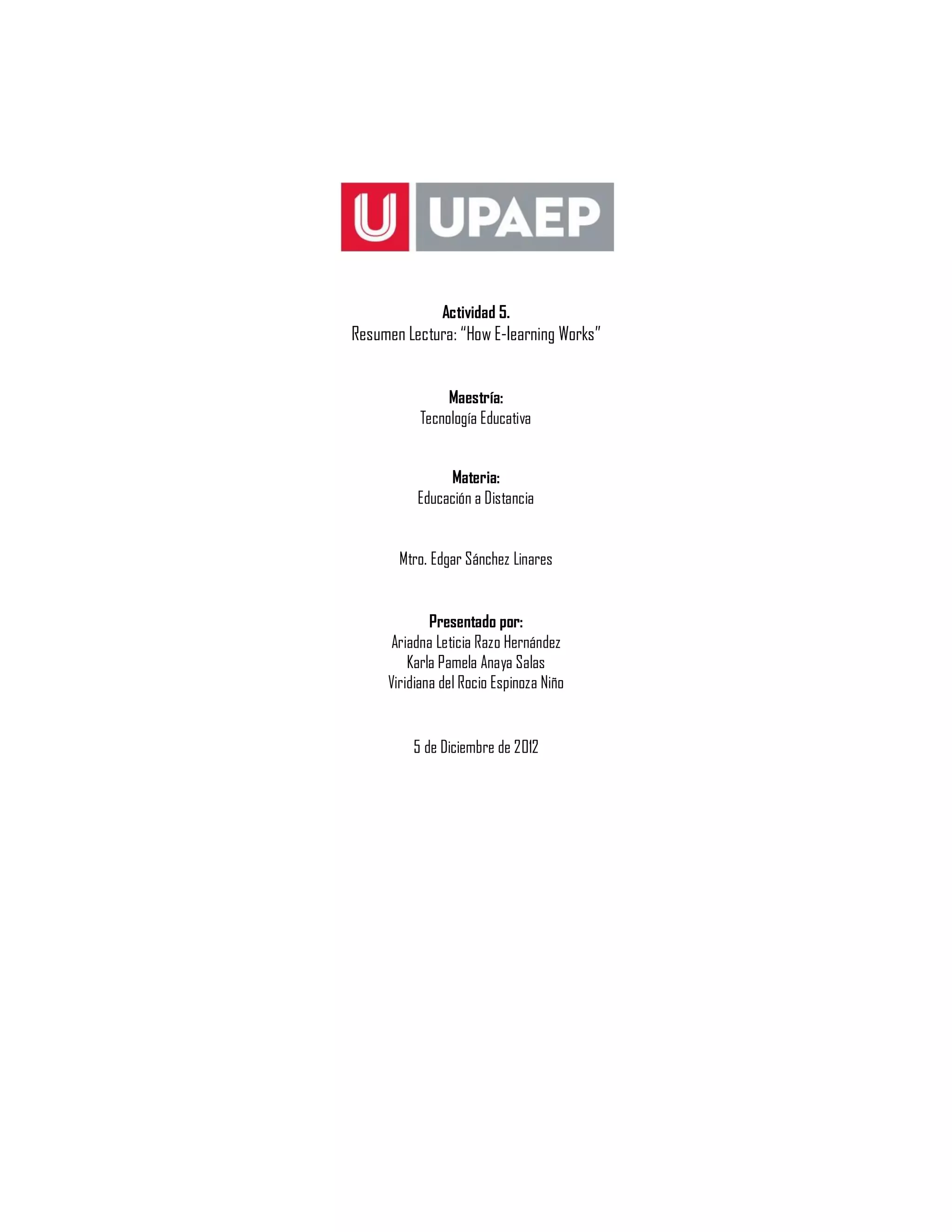 El documento describe los diferentes tipos de e-learning, incluyendo bases de datos de conocimiento, apoyo en línea, formación asíncrona y capacitación síncrona. Explica que el e-learning permite aprender en cualquier lugar y momento utilizando texto, video, audio y entornos virtuales. También discute los beneficios del e-learning como ser menos costoso, a un ritmo propio y con mayor retención del aprendizaje.