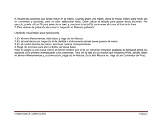Este documento explica qué son las macros en Word 2007 y cómo se pueden crear. Las macros permiten automatizar tareas mediante acciones o secuencias de acciones grabadas. Se pueden grabar macros seleccionando opciones en el menú Herramientas o escribiendo código en Visual Basic para Aplicaciones. Para grabar una macro, se selecciona "Grabar nueva macro" y luego se realizan los pasos a automatizar.