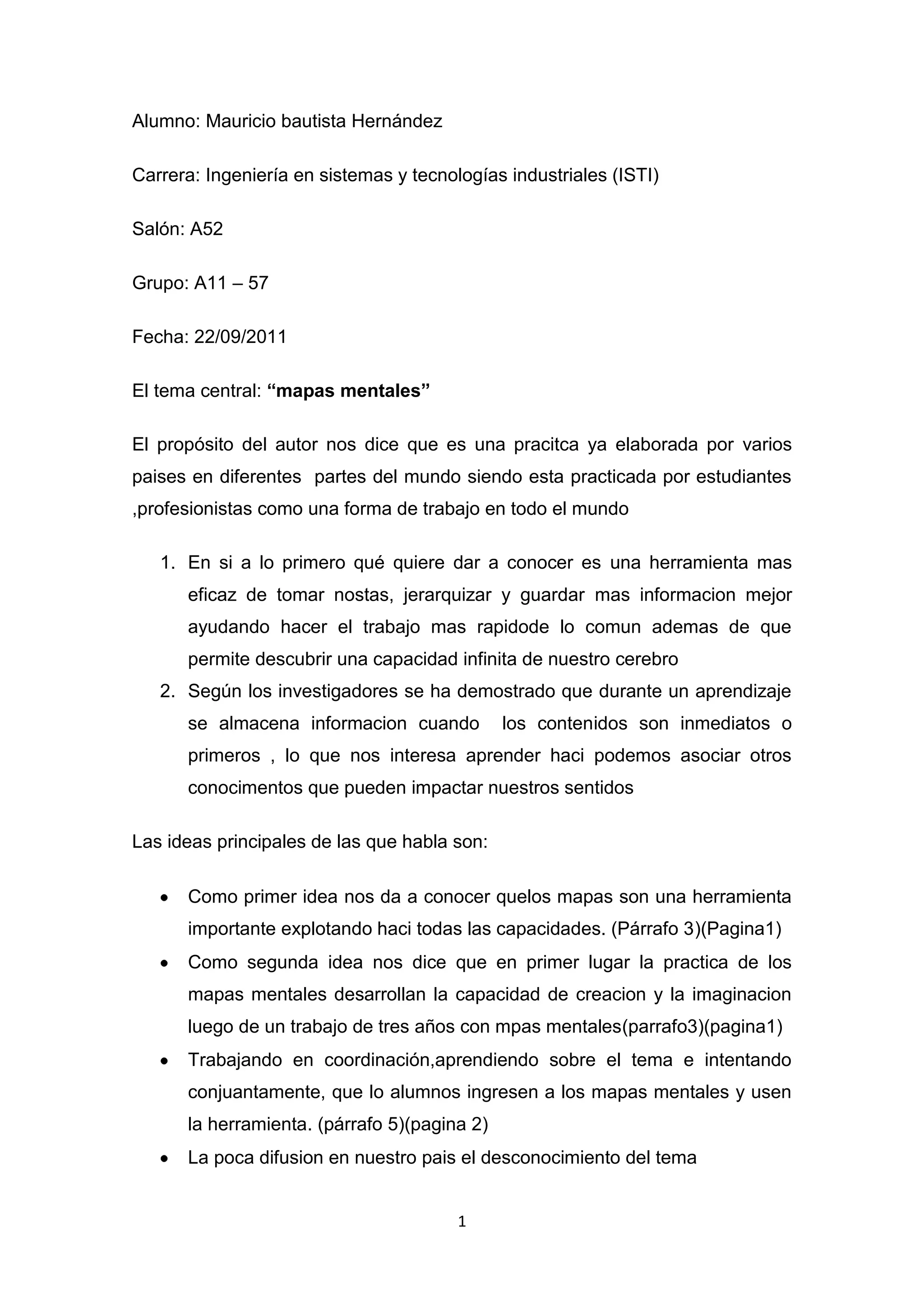 El documento habla sobre los mapas mentales, una herramienta que permite jerarquizar y retener más información de manera más eficiente. Según investigadores, la información se almacena mejor cuando los contenidos son inmediatos o primeros, por lo que los mapas mentales nos permiten asociar conocimientos previos. El autor concluye que los mapas mentales son una herramienta útil para destacar y tener éxito laboral al optimizar los tiempos de trabajo de manera influyente.