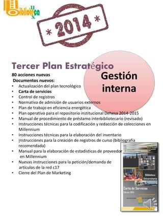 Este documento presenta un resumen de las actividades de la biblioteca universitaria en 2012. Incluye información sobre la gestión interna y documentos nuevos, gastos económicos, instalaciones y número de visitas, colecciones disponibles, procesos técnicos como catalogación, y usuarios atendidos a través de formaciones. También destaca el apoyo a la investigación a través de recursos como el repositorio institucional, que en 2012 contaba con más de 2,300 documentos depositados.