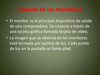 El documento describe la historia y clasificación de los monitores para computadoras. Comienza con los primeros monitores monocromáticos como el MDA y luego pasa a los monitores en color como el CGA, EGA y VGA, los cuales mejoraron la resolución y soporte de colores a través del tiempo. Luego cubre monitores posteriores como SVGA y clasifica los monitores según su tecnología, incluyendo CRT, LCD y plasma. Finalmente, explica conceptos como resolución y frecuencia de refresco.