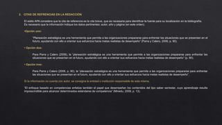 Este documento describe las normas para citar referencias y elaborar bibliografías siguiendo el estilo APA. Explica que las citas deben incluir el autor, año y página de forma abreviada. Ofrece tres opciones de citas textuales breves y describe cómo citar referencias indirectas, directas extensas y de más de tres autores. Por último, señala que la bibliografía debe listar ordenadamente las fuentes consultadas.