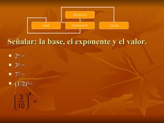Este documento explica los conceptos básicos de las potencias. Define potencia como un producto de factores iguales. Presenta las propiedades de las potencias como la multiplicación, división, potencias de exponente cero y negativo. También cubre cómo calcular potencias de potencias y el producto y división de potencias de igual exponente. Finalmente, introduce la notación científica para escribir números muy grandes y pequeños usando potencias de 10.