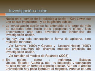 La investigación-acción es un método para mejorar la práctica educativa a través de la autorreflexión sistemática y el uso de técnicas de recolección de información. El documento describe las etapas de la investigación-acción, incluida la definición del problema, el desarrollo de una propuesta de acción, su implementación, evaluación y mejora continua. También proporciona ejemplos de cómo aplicar estas etapas para abordar un problema como aumentar la afición por la lectura entre los estudiantes.