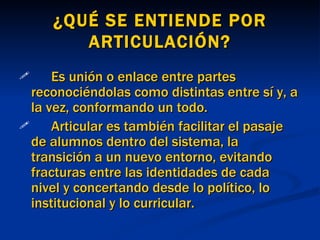 El documento describe la importancia de la articulación entre el nivel inicial y la escuela primaria. Actualmente existe un desencuentro entre los dos niveles debido a diferencias en las prácticas, orientaciones pedagógicas y concepciones de los docentes. La articulación requiere concertaciones institucionales, curriculares y conceptuales entre los dos niveles para garantizar la continuidad del aprendizaje y una transición no traumática para los estudiantes.