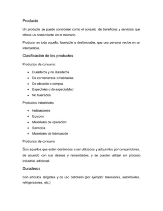 Este documento habla sobre diferentes temas relacionados con productos y su desarrollo. Define qué es un producto y clasifica los productos de consumo y los industriales. Explica elementos que componen un producto como la marca, etiqueta, envase y embalaje. También describe el proceso de desarrollo de nuevos productos y las estrategias utilizadas en las diferentes etapas del ciclo de vida de un producto.