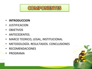 Este documento presenta un programa de educación ambiental propuesto para la Institución Educativa María Reina. Inicialmente, se realiza un diagnóstico que identifica la falta de una cultura ambiental como el principal problema. Luego, se definen los objetivos y enfoques del programa, los cuales buscan generar cambios positivos en el cuidado del medio ambiente a través de un enfoque interdisciplinario. Finalmente, se describe la metodología y cronograma de actividades del programa, el cual incluye talleres, campañas y celebraciones para crear con