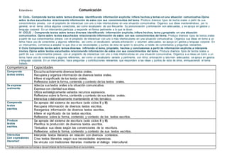 Este documento presenta las competencias y capacidades matemáticas requeridas en diferentes ciclos de educación primaria. Describe cinco competencias matemáticas generales: 1) actuar y pensar matemáticamente en situaciones de cantidad, 2) regularidad, equivalencia y cambio, 3) forma, movimiento y localización, 4) gestión de datos e incertidumbre, y 5) comunicación. Para cada competencia, enumera las capacidades asociadas como matematizar situaciones, comunicar y representar ideas matemáticas, elaborar y usar estrategias, y raz