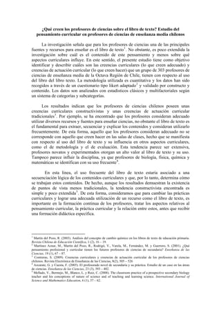 Este documento resume un estudio sobre las creencias de 303 profesores de ciencias de enseñanza media chilenos con respecto al uso del libro de texto. Los resultados indican que los profesores poseen creencias curriculares constructivistas pero creencias de actuación curricular más tradicionales, utilizando el libro de texto frecuentemente a pesar de considerar otros recursos adecuados. Aunque reconocen enfoques menos tradicionales, su tendencia es seguir usando el libro de texto para secuenciar contenidos de forma tradicional.