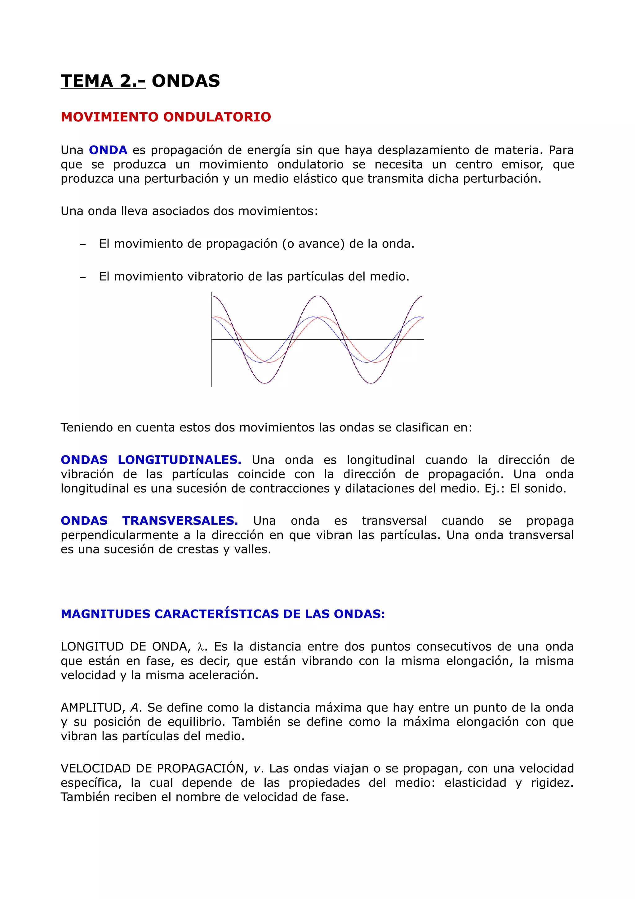 1) Una onda es la propagación de energía a través de un medio sin que haya desplazamiento de materia. 2) Existen dos tipos de ondas: longitudinales, donde la dirección de vibración coincide con la dirección de propagación, y transversales, donde la vibración es perpendicular. 3) Las ondas se caracterizan por su longitud de onda, amplitud y velocidad.