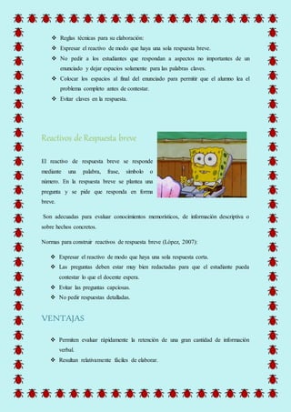Este documento describe diferentes tipos de reactivos para evaluaciones. Explica que un reactivo es una pregunta, afirmación, problema o acción a responder o resolver en una evaluación. Describe los reactivos de complementación, que piden al estudiante proveer la respuesta en lugar de elegirla, y los reactivos de respuesta breve, que se responden con una palabra o número. Proporciona normas y ventajas y desventajas de estos tipos de reactivos.