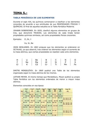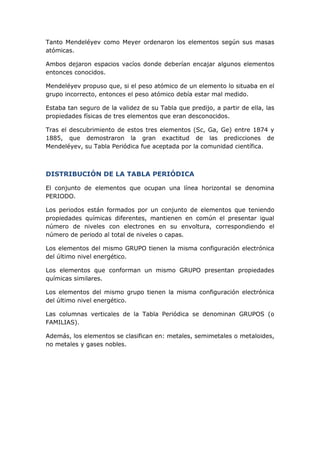 El documento describe la historia y desarrollo de la tabla periódica de los elementos, incluyendo las contribuciones de Dobereiner, Newlands, Mendeléyev y Meyer. Explica la distribución y clasificación de los elementos en la tabla periódica de acuerdo a sus propiedades periódicas y de valencia. También define los diferentes grupos de elementos como metales alcalinos, metales alcalinotérreos, metales de transición, halógenos, gases nobles y sus características.