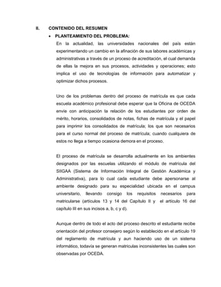 Este documento describe un proyecto de investigación para implementar una aplicación web que mejore el proceso de matrícula de los estudiantes de pregrado en la Universidad Nacional del Santa. El proyecto utilizará las tecnologías JPA y JSF para desarrollar un sistema en línea que agilice el proceso de matrícula, reduzca el número de errores, y brinde información más rápidamente a las partes interesadas.