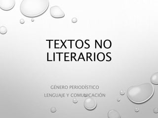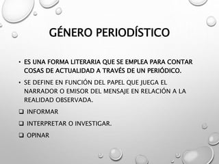 Este documento resume los principales géneros periodísticos. Explica que existen tres tipos de textos según su grado de objetividad: informativos, interpretativos/investigativos y de opinión. Dentro de los informativos se encuentra la noticia, mientras que el reportaje y la reseña crítica son interpretativos. Los textos de opinión incluyen el editorial, la columna y el artículo. Además, describe las características y estructura básica de la noticia y el editorial.
