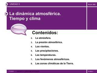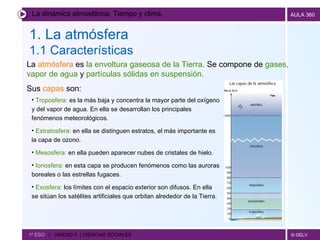 El documento describe los conceptos básicos de la dinámica atmosférica, el tiempo y el clima. Explica que la atmósfera está compuesta de gases y partículas en suspensión y se divide en varias capas. Luego describe cómo factores como la presión atmosférica, los vientos, las precipitaciones y las temperaturas dan lugar a fenómenos meteorológicos que determinan el tiempo y el clima de un lugar. Finalmente, clasifica las zonas de la Tierra según sus características climáticas.