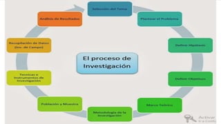 Este documento trata sobre la investigación científica. Explica que la investigación científica es la búsqueda sistemática y metódica de conocimientos o soluciones a problemas mediante el método científico. Describe dos formas de investigación: la investigación pura, que busca crear teorías, y la investigación aplicada, que busca solucionar problemas concretos. También habla sobre los requisitos para realizar investigación científica y la importancia de la planificación en el proceso de investigación.