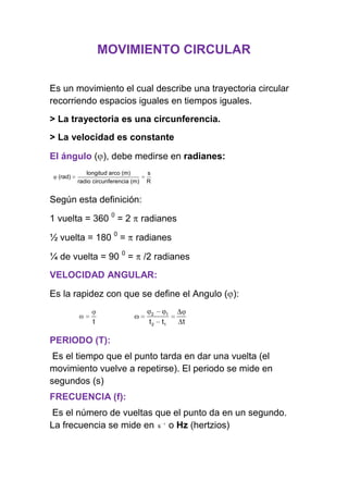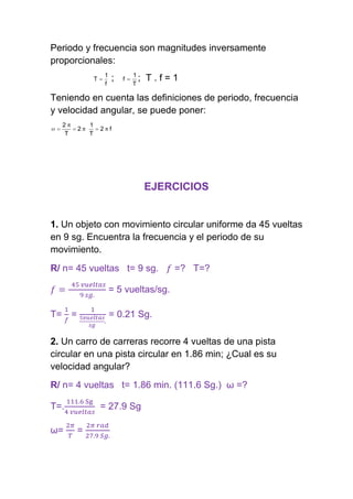 Este documento define conceptos básicos del movimiento circular uniforme, incluyendo periodo, frecuencia, velocidad angular y aceleración centrípeta. Explica que la velocidad es constante en el movimiento circular, mientras que el ángulo y la posición cambian constantemente a medida que el objeto se mueve en una trayectoria circular. Además, presenta ejemplos numéricos para calcular estas cantidades a partir de datos como el número de vueltas, tiempo, radio y velocidad lineal.