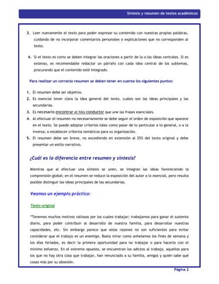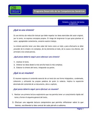 El documento explica la diferencia entre una síntesis y un resumen. Una síntesis integra las ideas principales de un texto para dar una comprensión global, mientras que un resumen reduce el texto a su contenido esencial pero mantiene las ideas principales y secundarias distinguidas. El documento también provee los pasos recomendados para realizar una síntesis y un resumen de manera efectiva.
