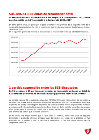 La temporada 2008/2009 de la Quiniela fue la primera con 55 jornadas y estableció récords de recaudación e incremento de acertantes de 14 resultados. Se recaudaron 541.496.513 euros en total, aunque hubo una ligera caída del 4,5% debido a la crisis. Solamente se suspendió 1 de los 825 partidos programados.