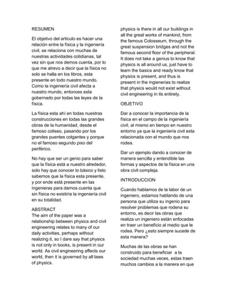 El documento describe la relación entre la física y la ingeniería civil. Explica que la física gobierna todas las construcciones de ingeniería civil debido a que estas afectan nuestro mundo y están sujetas a las leyes de la física. Da como ejemplo una presa y cómo se debe considerar conceptos físicos como la velocidad del río, la presión del agua y la gravedad para su diseño correcto. Concluye que sin el conocimiento de la física no sería posible el alto nivel de desarrollo tecnológico de
