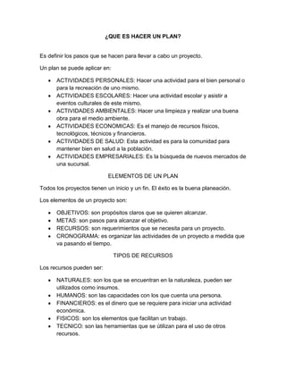 El documento resume los elementos clave de hacer un plan, incluyendo definir objetivos, metas y recursos requeridos, y organizar actividades en un cronograma. Explica que un plan se puede aplicar a actividades personales, escolares, ambientales, de salud, económicas y empresariales. Además, detalla los diferentes tipos de recursos como naturales, humanos, financieros, físicos y técnicos.