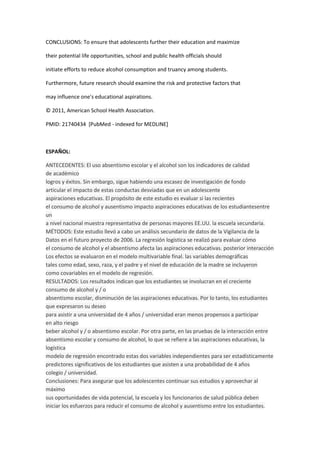 1. El estudio examinó el impacto del consumo de alcohol y absentismo escolar en las aspiraciones educativas de estudiantes estadounidenses de último año de secundaria. Los resultados mostraron que cuanto mayor es el consumo de alcohol y el absentismo, menores son las aspiraciones educativas.