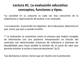 La evaluación educativa debe tener como propósito principal verificar el progreso de los aprendizajes de los estudiantes y no su calificación. Implica tener claridad sobre los objetivos y competencias a desarrollar, y utilizar métodos de evaluación continua y flexibles que permitan reforzar avances y superar dificultades, considerando las diferencias individuales entre los estudiantes.
