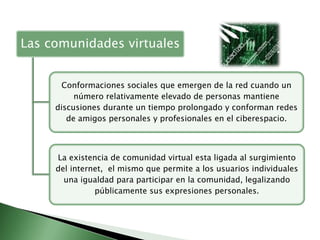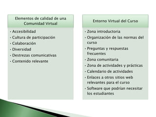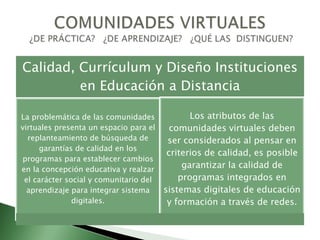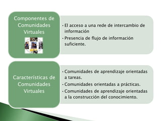 Las comunidades virtuales de práctica y aprendizaje comparten conocimiento de forma recíproca a través de un proceso social de aprendizaje. Mientras que las comunidades de práctica se enfocan en resolver problemas e intercambiar experiencias, las comunidades de aprendizaje buscan lograr roles docentes y aprendizaje colaborativo. Ambas han cambiado la educación al fomentar el aprendizaje más allá de instituciones y a lo largo de la vida. Los educadores deben mantener propósitos educativos para apro
