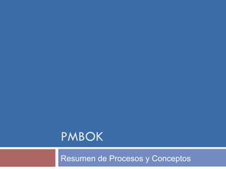 El PMBOK describe procesos y conceptos de gestión de proyectos, abarcando áreas clave como la integración, alcance, tiempo, costos, calidad, recursos humanos, comunicaciones, riesgos, adquisiciones e interesados. Cada área incluye procesos específicos, desde la planificación y ejecución hasta el control y cierre del proyecto, asegurando que todos los aspectos necesarios se gestionen adecuadamente para cumplir con los objetivos. El documento enfatiza la importancia de la definición temprana del alcance y la comunicación efectiva entre los interesados para el éxito del proyecto.