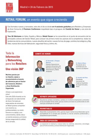 El documento presenta el evento Retail Forum 2015, que ofrece sesiones y conferencias sobre temas clave para el sector retail como la omnicanalidad, la experiencia del cliente, el neuromarketing y el compromiso. El evento contará con 47 ponentes de importantes empresas como Rakuten, Ulabox, Campofrío y Loewe. El objetivo es que los asistentes obtengan información y conozcan las últimas tendencias para aumentar las ventas y lograr experiencias de compra únicas.
