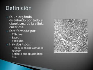 El retículo endoplasmático es un orgánulo distribuido por el citoplasma de la célula eucariota, formado por túbulos, sacos y vesículas. Existen dos tipos: rugoso, con ribosomas adheridos; y liso. Participa en la síntesis y transporte de proteínas.