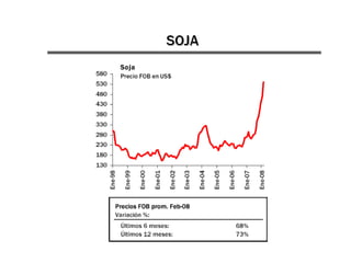 Este documento resume la crisis entre el gobierno argentino y el sector agropecuario por el decreto 125 que aumentó las retenciones a la soja. Detalla las fortalezas de la cadena de soja en Argentina y cómo el decreto generó una fuerte reacción del sector. También analiza los impactos económicos del paro agropecuario y posibles consecuencias políticas de la crisis.