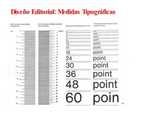 El documento describe el sistema de medidas tipográficas basado en el punto de Didot y define unidades como el cícero y el punto. Explica que el tamaño de los caracteres se mide en cuerpos y su grosor en puntos. También presenta diferentes tipos de letra como Garamond, Baskerville, Bodoni, Helvetica y Times, y recomienda anchos de columna dependiendo del tamaño y espaciado del texto.