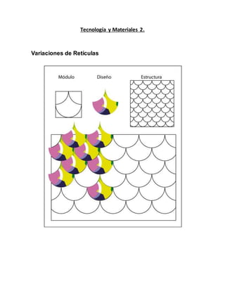 El documento describe diferentes tipos de repetición de módulos y variaciones de retículas que pueden usarse en el diseño. Describe ocho tipos de repetición de módulos, incluyendo la repetición de figura, tamaño, color, textura, dirección, posición, espacio y gravedad. También describe varias variaciones de la retícula básica, como cambios de proporción, dirección, deslizamiento, curvatura, reflexión, combinación y divisiones ulteriores, así como retículas triangulares y hexagonales.