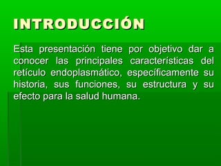 El documento describe el retículo endoplasmático, incluyendo su historia, estructura, funciones y efecto en la salud humana. Existen dos tipos de retículo endoplasmático: el rugoso y el liso. El retículo endoplasmático rugoso sintetiza proteínas con la ayuda de ribosomas adheridos, mientras que el liso desempeña funciones como la detoxificación y síntesis de lípidos. Ambos tipos desempeñan un papel importante en la supervivencia celular y protección contra toxinas.