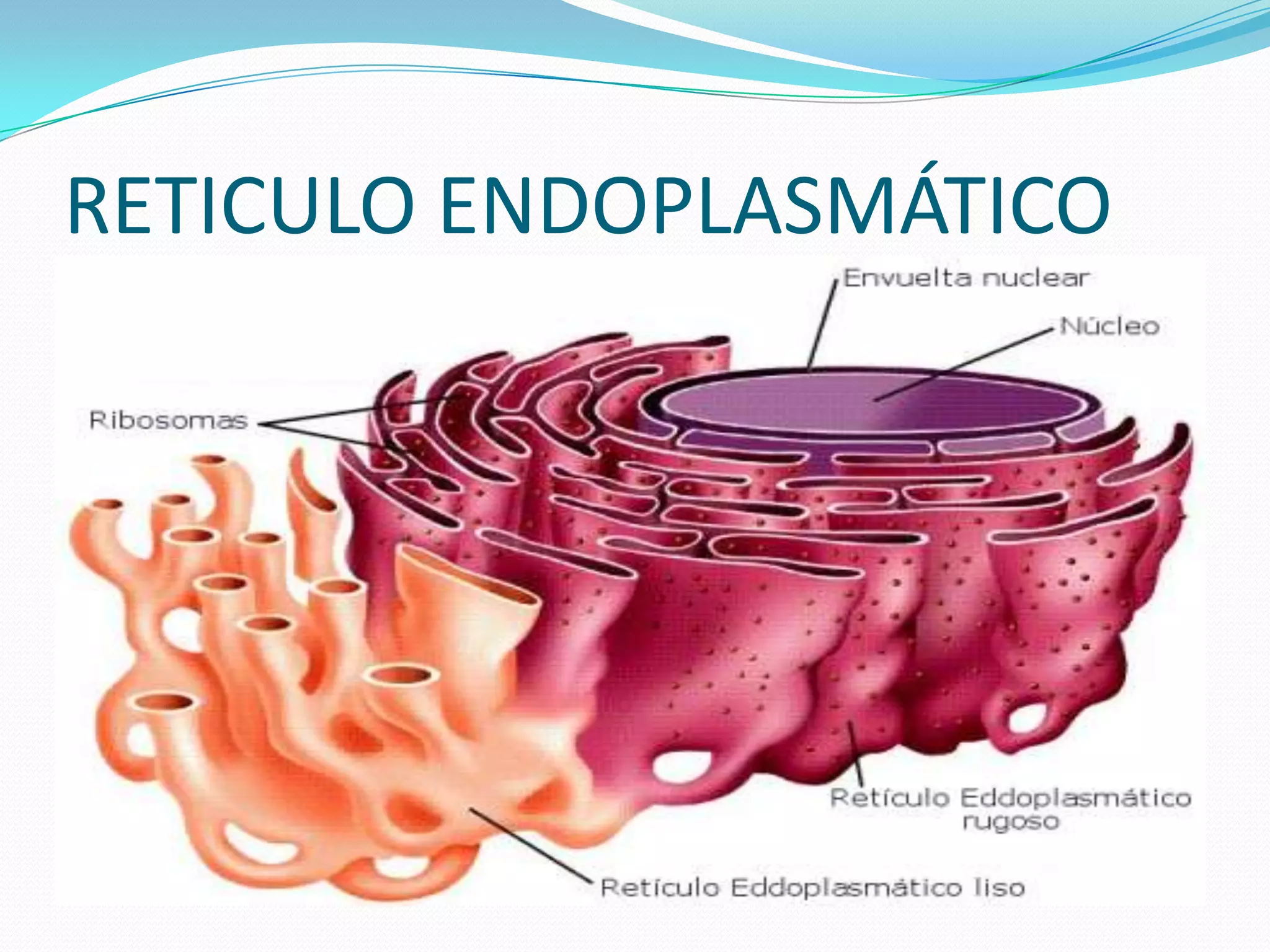 El retículo endoplasmático es una red de membranas que forma cisternas y tubos. Existen dos tipos: el retículo endoplasmático rugoso, donde se sintetizan proteínas gracias a los ribosomas unidos a su membrana, y el retículo endoplasmático liso, abundante en células que sintetizan lípidos y hormonas, que participa en la síntesis de membranas y el almacenamiento de calcio. Ambos tipos intervienen en funciones como la síntesis de lípidos