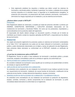 El RETIE es el Reglamento Técnico de Instalaciones Eléctricas de Colombia que establece medidas de seguridad para instalaciones eléctricas. Se aplica a nuevas instalaciones, ampliaciones y remodelaciones mayores de 10 KVA. El RETILAP regula la iluminación y alumbrado público en Colombia para garantizar niveles lumínicos seguros y proteger el medio ambiente. Ambos reglamentos deben ser cumplidos por diseñadores, constructores y empresas eléctricas.