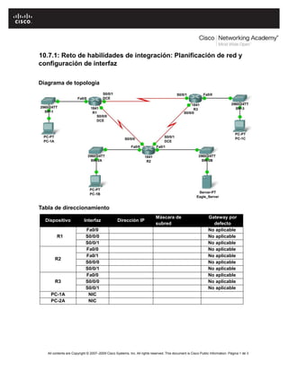Este documento describe un ejercicio de práctica para configurar una red con 3 routers y varios hosts. Los estudiantes deben crear una topología física, planificar un esquema de direccionamiento IP usando la subred 192.168.1.0/24, y configurar las interfaces de los routers, PCs y servidor según el esquema. Finalmente, deben verificar la conectividad entre los dispositivos.