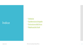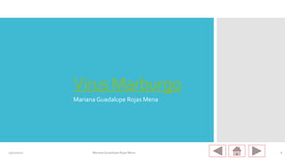 El documento describe la historia, estructura y replicación del virus de Marburgo. El virus fue aislado por primera vez en 1967 en Marburgo, Alemania tras una epidemia entre el personal de un laboratorio. En 2004 hubo otra epidemia en Angola que causó 374 casos y 329 muertes. El virus tiene una morfología irregular y contiene ARN de polaridad negativa envuelto en una nucleocápside dentro de una envoltura viral. El virus ingresa a las células hospedadoras mediante una glicoproteína de superficie y se replica en el cit