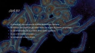 El documento describe el virus de Marburgo, una enfermedad hemorrágica que se originó en Marburgo, Alemania. Se transmite a los humanos por los simios ugandeses y causa brotes como el de 2004 en Angola que resultó en 374 casos y 329 muertes. El virus ingresa a las células humanas y se replica en casi todos los órganos, potencialmente causando una infección mortal. No existe una cura conocida pero se están desarrollando vacunas.