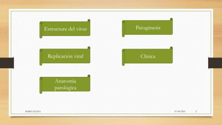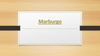 El documento describe el virus de Marburgo, incluyendo su estructura, réplica viral, y manifestaciones clínicas. El virus de Marburgo es un filovirus que causa fiebre hemorrágica y fue aislado por primera vez en 1967 en Marburgo, Alemania. Presenta una morfología irregular de 800-1400 nm de largo y usa su glicoproteína de superficie para ingresar a las células, aunque el receptor específico es desconocido. La replicación ocurre en el citoplasma y produce síntomas como fiebre