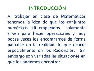 El documento presenta ejemplos de cómo los números racionales se pueden encontrar en situaciones de la vida real, más allá de solo usarlos para operaciones matemáticas. Muestra que preparar chocolate para 3 personas usando 2 pastillas de una libra que tiene 16 pastillas total es un ejemplo de un número racional (2/16 = 1/8). También propone como reto que los estudiantes envíen imágenes que muestren ejemplos ingeniosos de números racionales en la vida real.